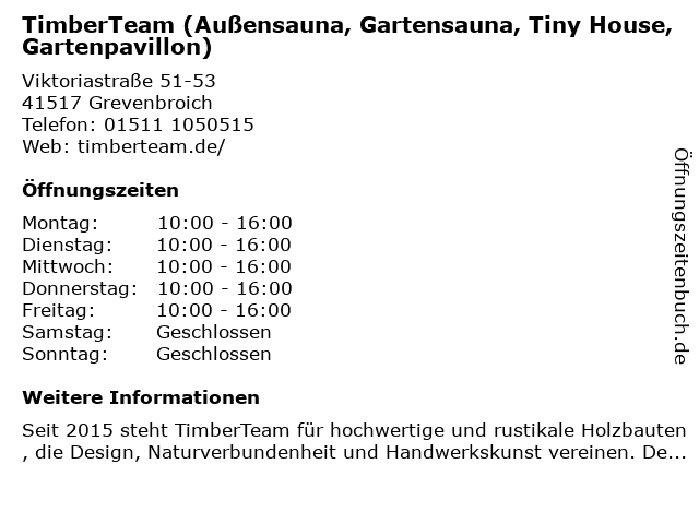 1 TimberTeam (Außensauna, Gartensauna, Holzpavillon) (Entfernung: 0,00 km) Viktoriastraße 51-53, 41517 Grevenbroich 6 |