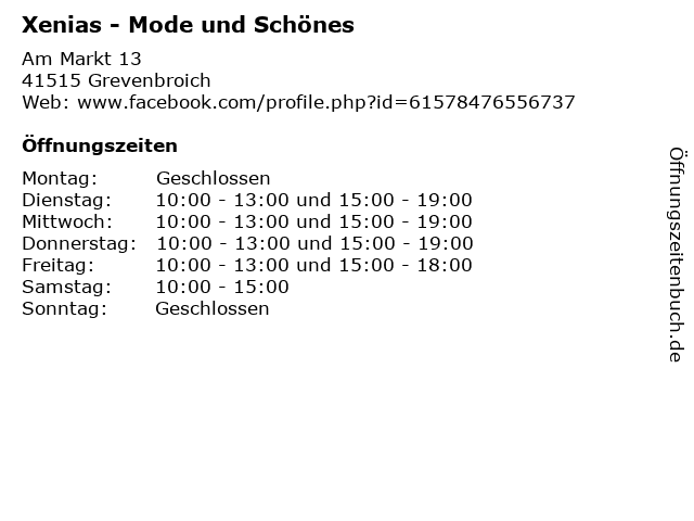 | Öffnungszeiten Xenias - Mode und Schönes in Grevenbroich anzeigen | |