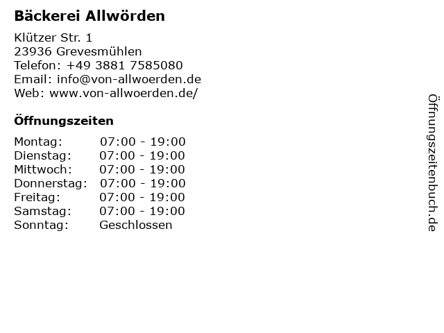 | Öffnungszeiten Bäckerei Allwörden in Grevesmühlen anzeigen | |