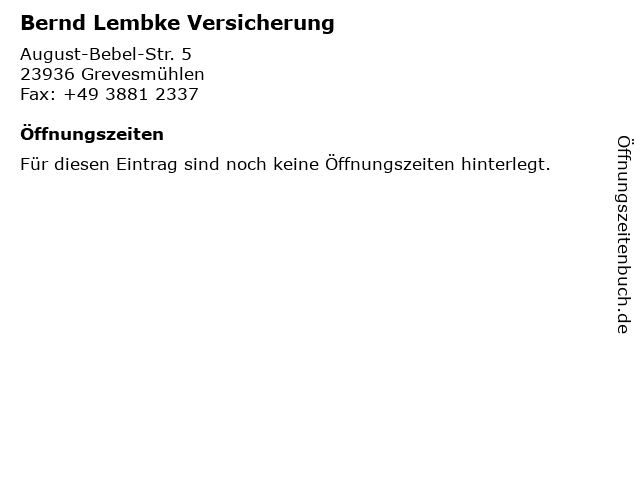 | Öffnungszeiten Bernd Lembke Versicherung in Grevesmühlen anzeigen | |