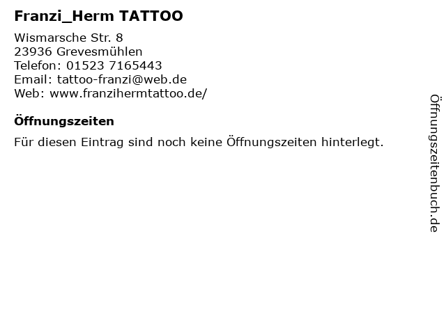 | Öffnungszeiten Franzi_Herm TATTOO in Grevesmühlen anzeigen | |
