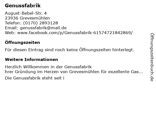 | Telefonnummer Genussfabrik in Grevesmühlen ((0170) 2893128) anrufen | |