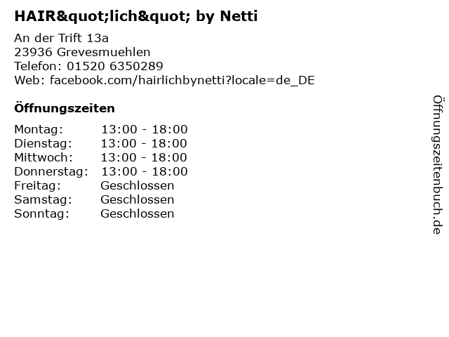 | Öffnungszeiten HAIR"lich" by Netti in Grevesmuehlen anzeigen | |