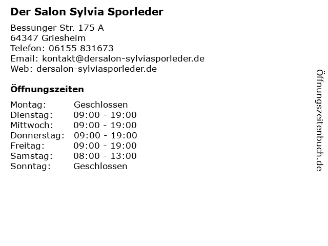 | Öffnungszeiten Der Salon Sylvia Sporleder in Griesheim anzeigen | |