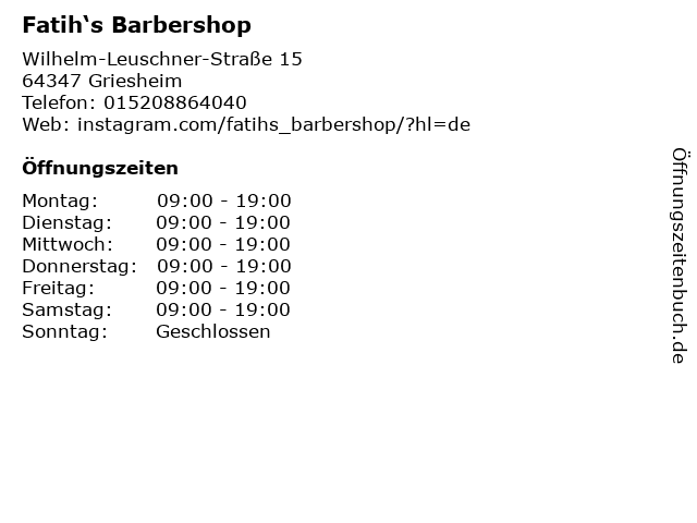 | Öffnungszeiten Fatih‘s Barbershop in Griesheim anzeigen | |