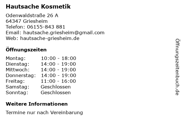| Öffnungszeiten Hautsache Kosmetik in Griesheim anzeigen | |
