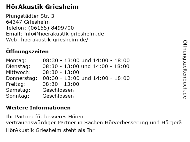 | Öffnungszeiten HörAkustik Griesheim in Griesheim anzeigen | |