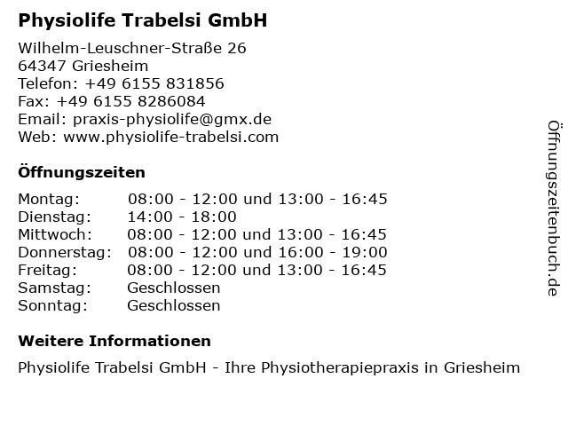 | Telefonnummer Physiolife Trabelsi GmbH in Griesheim (+49 6155 831856) anrufen | |
