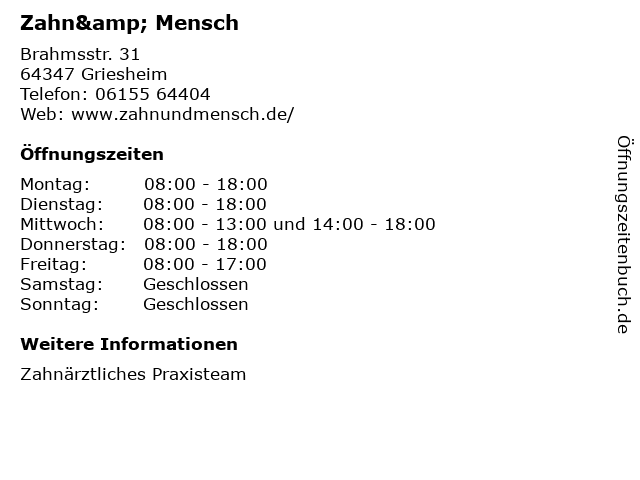 | Öffnungszeiten Zahn& Mensch in Griesheim anzeigen | |