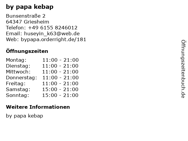 | Telefonnummer by papa kebap in Griesheim (+49 6155 8246012) anrufen | |