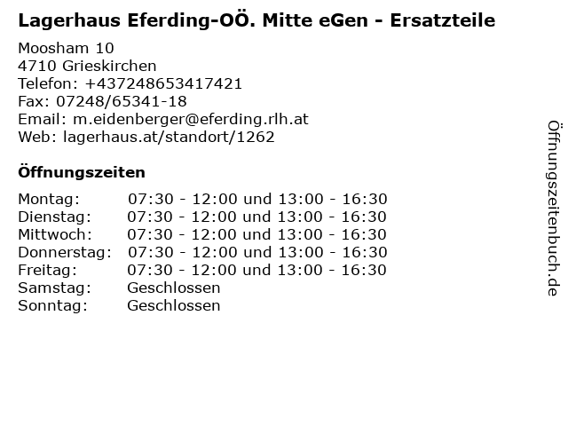 1 Lagerhaus Eferding-OÖ. Mitte eGen - Landmaschinen-Handel (Entfernung: 0,00 km) Moosham 10, 4710 Grieskirchen 2 Lagerhausgenossenschaft Eferding-Grieskirchen eGen - alle Abteilungen (Entfernung: 12,63 km) Obeltsham 7, 4673 Gaspoltshofen 3 Lagerhausgenossenschaft Schärding am Inn reg.Gen.m.b.H. (Entfernung: 15,98 km) Wildhag 3, 4755 Zell an der Pram 4 Lagerhausgenossenschaft Schärding am Inn reg.Gen.m.b.H. (Entfernung: 15,99 km) Wildhag 3, 4755 Zell an der Pram 5 Lagerhausgenossenschaft Eferding-Grieskirchen eGen - Rundholzhandel (Entfernung: 16,84 km) Bahnhofstraße 51-55, 4070 Eferding 6 Lagerhausgenossenschaft Eferding-Grieskirchen eGen - Werkstätte PKW (Entfernung: 16,84 km) Bahnhofstraße 51-55, 4070 Eferding |