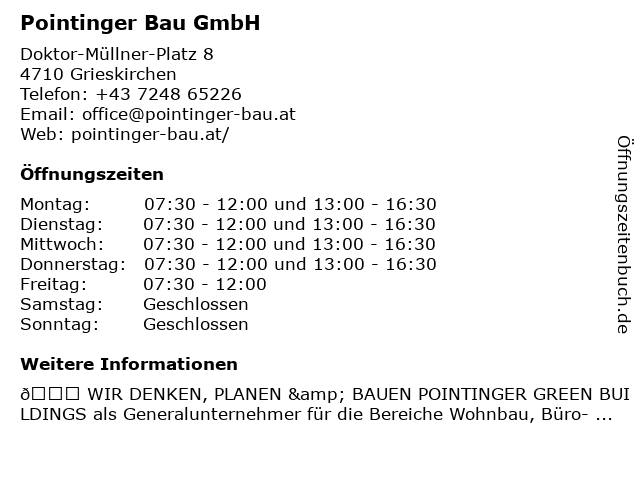 | Öffnungszeiten Pointinger Bau GmbH in Grieskirchen anzeigen | |