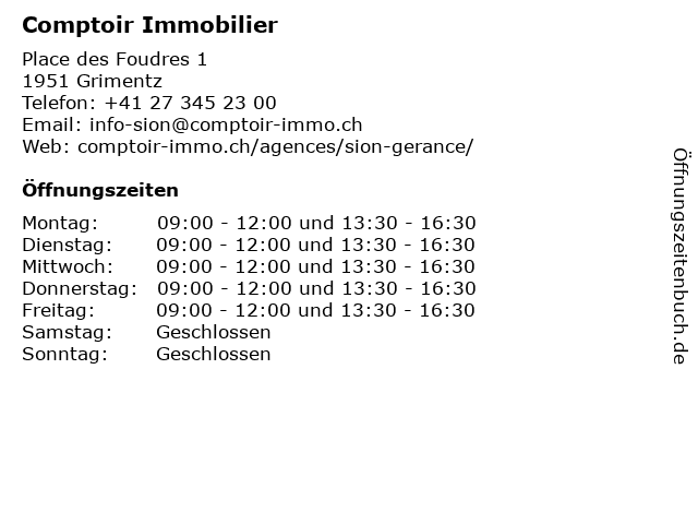 | Öffnungszeiten Comptoir Immobilier in Grimentz anzeigen | |
