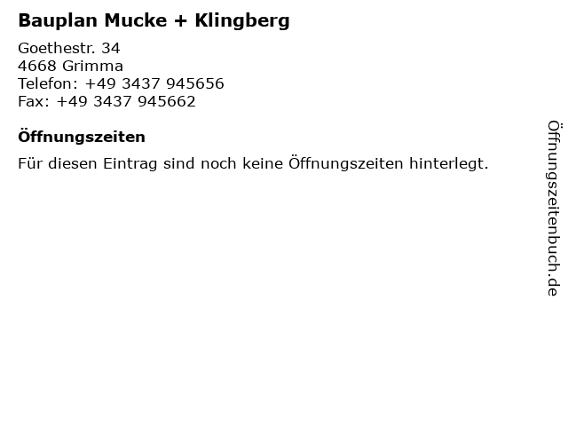 | Öffnungszeiten Bauplan Mucke + Klingberg in Grimma anzeigen | |