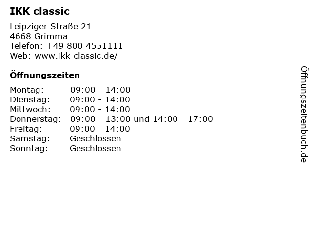 | Öffnungszeiten IKK classic in Grimma anzeigen | |