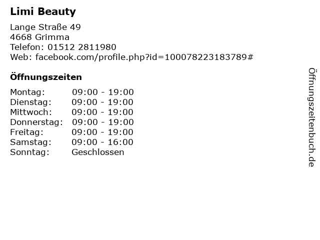 | Öffnungszeiten Limi Beauty in Grimma anzeigen | |
