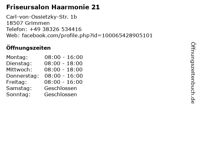 | Öffnungszeiten Friseursalon Haarmonie 21 in Grimmen anzeigen | |