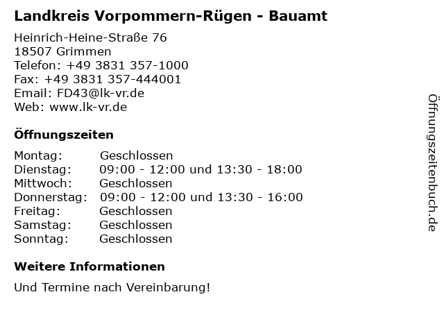 3 Kommunales Jobcenter Nordvorpommern - Landkreis Vorpommern-Rügen (Entfernung: 0,55 km) Bahnhofstraße 16, 18507 Grimmen 4 CDU Kreisverband Vorpommern-Rügen, Kreisgeschäftsstelle Außenstelle Grimmen (Entfernung: 0,66 km) Bahnhofstraße 48, 18507 Grimmen 6 |
