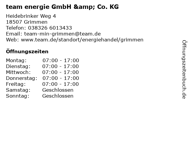| Öffnungszeiten team energie GmbH & Co. KG in Grimmen anzeigen | |