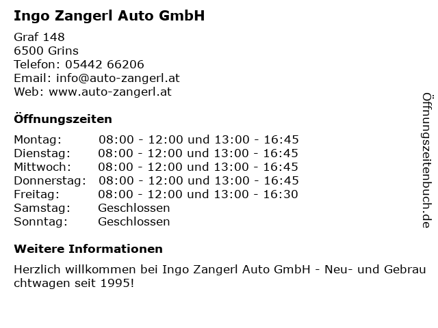 | Öffnungszeiten Ingo Zangerl Auto GmbH in Grins anzeigen | |