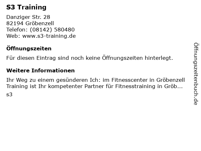 | Öffnungszeiten S3 Training in Gröbenzell anzeigen | |