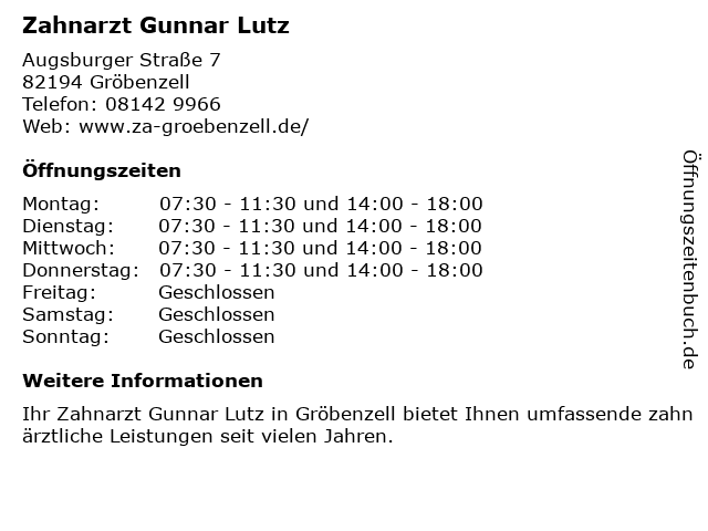 | Öffnungszeiten Zahnarzt Gunnar Lutz in Gröbenzell anzeigen | |