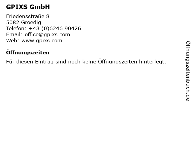 | Öffnungszeiten GPIXS GmbH in Groedig anzeigen | |