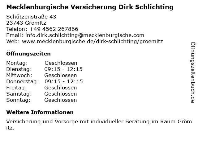 | 1 Mecklenburgische Versicherung Dirk Schlichting (Entfernung: 17,12 km) Carl-Maria-von-Weber-Straße 2A, 23758 Oldenburg in Holstein 6 |