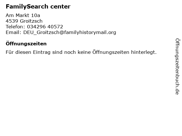 | Öffnungszeiten FamilySearch center in Groitzsch anzeigen | |