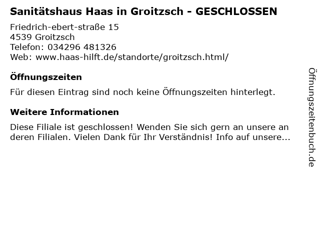 | Sanitätshaus Haas in Groitzsch - GESCHLOSSEN anrufen | |