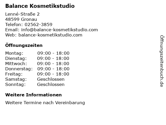| Öffnungszeiten Balance Kosmetikstudio in Gronau anzeigen | |