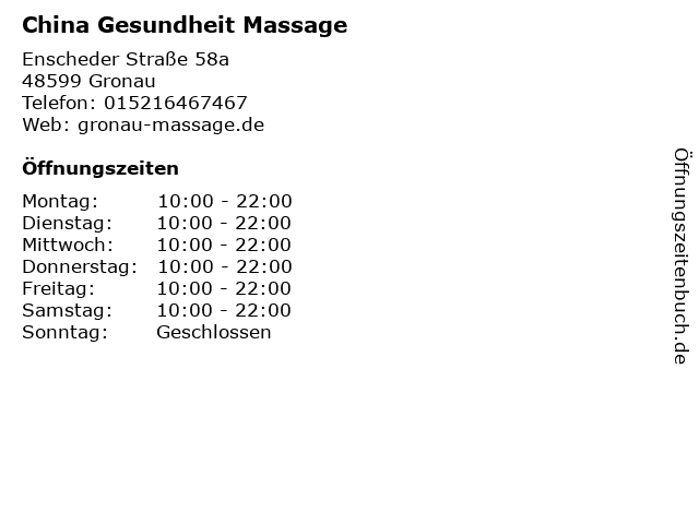 | Öffnungszeiten China Gesundheit Massage in Gronau anzeigen | |