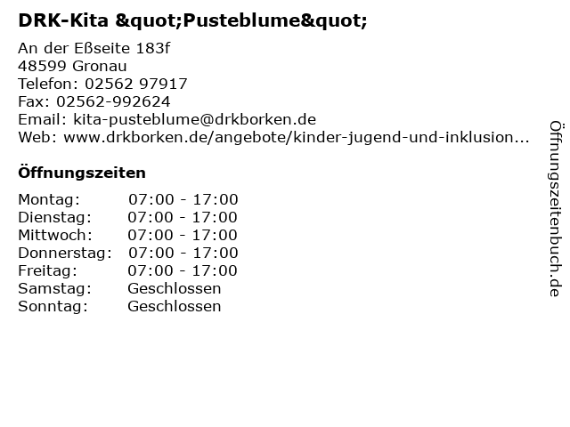 | Öffnungszeiten DRK-Kita "Pusteblume" in Gronau anzeigen | |