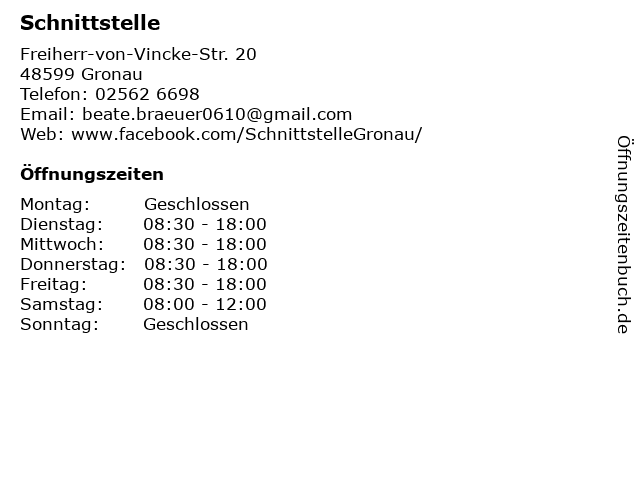 | Öffnungszeiten Schnittstelle in Gronau anzeigen | |