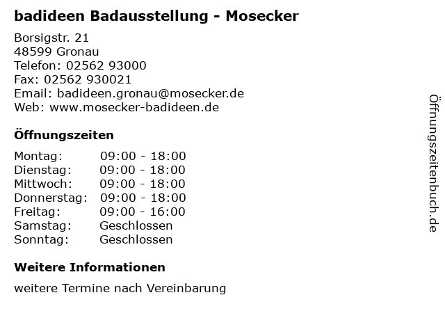 3 Elting GmbH - Fachgroßhandel Haustechnik - Badausstellung (Entfernung: 13,99 km) Dieselstraße 20, 48683 Ahaus 4 badpunkt Badaustellung - Pietsch Ahaus Holtgräve GmbH & Co. KG (Entfernung: 15,61 km) Von-Braun-Straße 17-19, 48683 Ahaus 5 badpunkt Badausstellung Nordhorn - Elmer (Entfernung: 24,10 km) Alfred-mozer-straße 9, 48527 Nordhorn 6 Elting GmbH - Fachgroßhandel Haustechnik - Badausstellung (Entfernung: 38,18 km) Südring 46, 46342 Velen-Ramsdorf |
