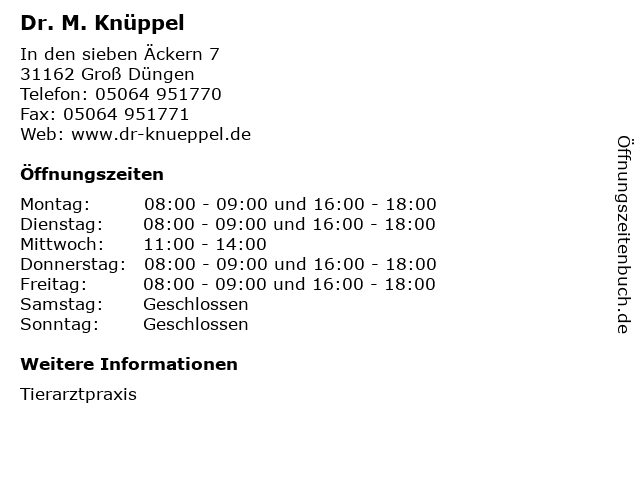 | Öffnungszeiten Dr. M. Knüppel in Groß Düngen anzeigen | |