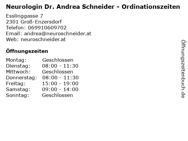 Branchen & Suchbegriffe zu Neurologin Dr. Andrea Schneider - Ordinationszeiten:andrea, dr., gesund, neurologin, neurologische, ordinationszeiten, praxis, schneider, therapie |