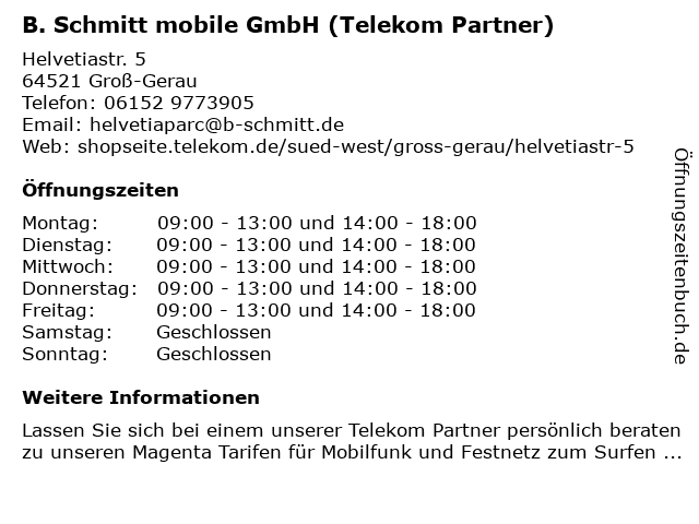 1 B. Schmitt mobile GmbH (Telekom Partner) (Entfernung: 1,94 km) Frankfurter Str. 35-39, 64521 Groß-Gerau 6 |