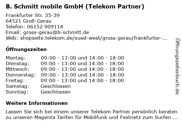 Öffnungszeiten B. Schmitt mobile GmbH (Telekom Partner)