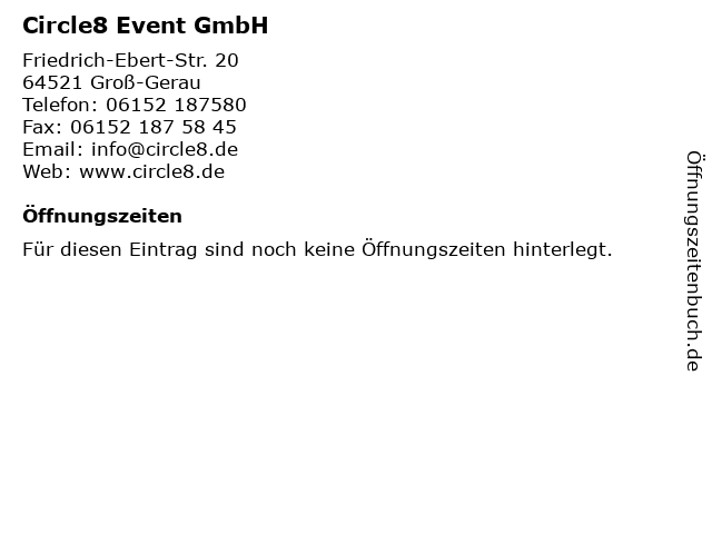 | Öffnungszeiten Circle8 Event GmbH in Groß-Gerau anzeigen | |