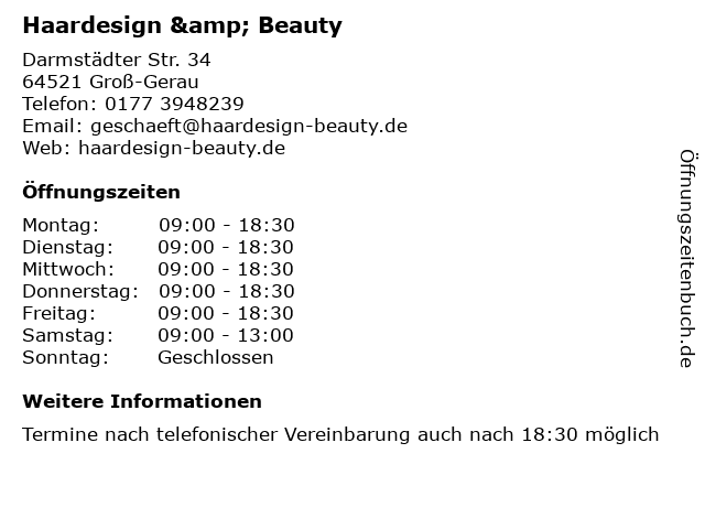 | Öffnungszeiten Haardesign & Beauty in Groß-Gerau anzeigen | |