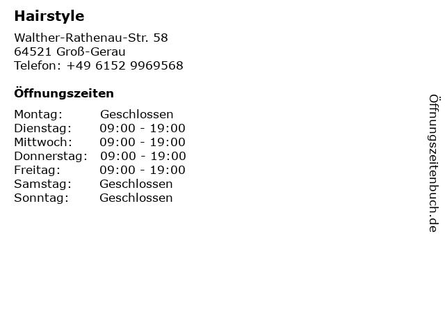 | Öffnungszeiten Hairstyle in Groß-Gerau anzeigen | |