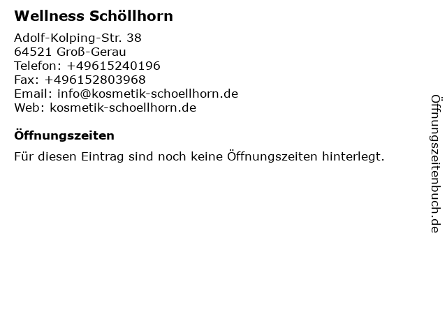 | Öffnungszeiten Wellness Schöllhorn in Groß-Gerau anzeigen | |