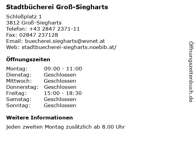 Branchen & Suchbegriffe zu Stadtbücherei Groß-Siegharts:bücherei, gemeindeamt, groß, siegharts, stadtbücherei |