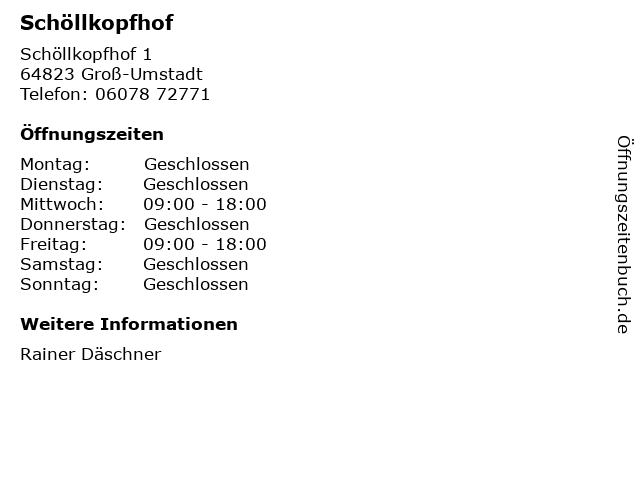 | Öffnungszeiten Schöllkopfhof in Groß-Umstadt anzeigen | |