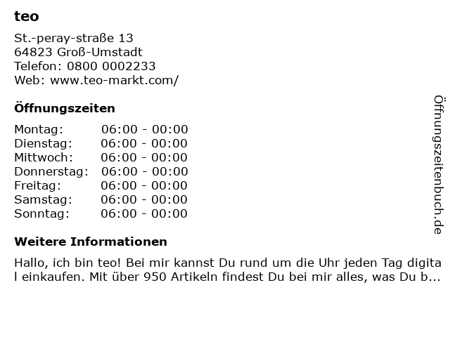 | Öffnungszeiten teo in Groß-Umstadt anzeigen | |