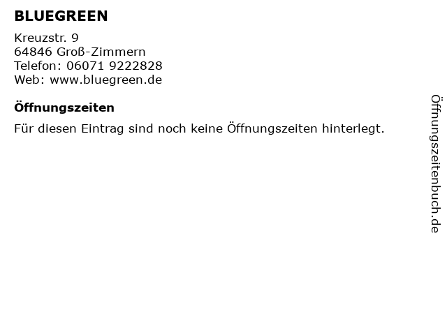 | Öffnungszeiten BLUEGREEN in Groß-Zimmern anzeigen | |