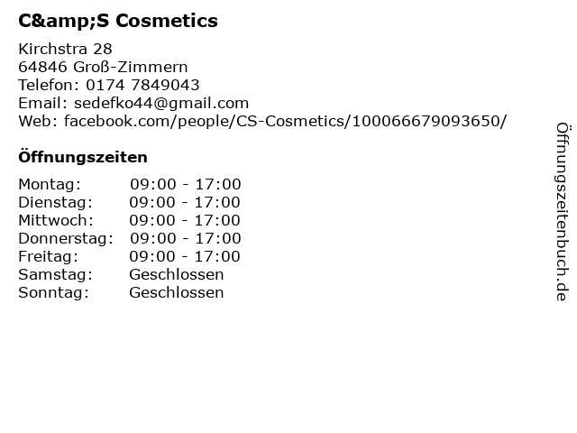 | Öffnungszeiten C&S Cosmetics in Groß-Zimmern anzeigen | |