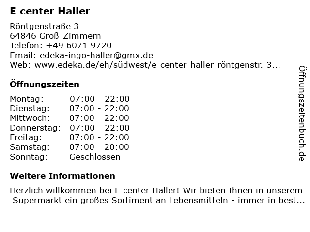 Öffnungszeiten E center Haller in Groß-Zimmern anzeigen | |