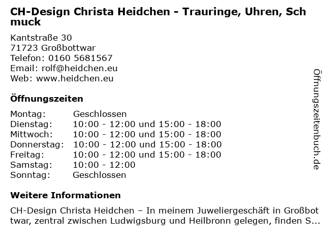Branchen & Suchbegriffe zu CH-Design Christa Heidchen - Trauringe, Uhren, Schmuck:ch, christa, design, gewerbliche reinigung, heidchen, reparaturservice für schmuck, schmuck, schmuckgeschäft, trauringe, uhren |